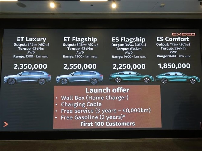 ويتميز طراز EXEED ES بمدى قيادة شامل يصل إلى 1,450 كيلومتر لفئة ES Comfort، و1,270 كيلومتر للفئة ES Flagship، مع إمكانية الشحن السريع من 20% إلى 80% خلال 17.5 دقيقة، وقدرته على التسارع من صفر إلى 100 كم/س في 4.6 ثانية. أما طراز EXEED ET فيوفر مدى قيادة يصل إلى 1,340 كيلومتر لكلا الفئتين ET Luxury، وET Flagship، ويحتاج إلى 17.5 دقيقة فقط للشحن السريع من 30% إلى 80%، بما يجعله من أكثر الطرازات كفاءة واعتمادية في فئتهما.
