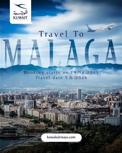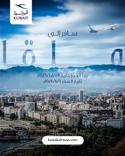 في إطار خطتها لتقديم خيارات متنوعة للمسافرين الكرام في موسم السفر الصيفي 2026، أعلنت شركة الخطوط الجوية الكويتية عن اطلاق رحلاتها المجدولة المباشرة لمدينة ملقا الاسبانية اعتباراً من تاريخ 5 يونيو 2026 وبواقع 3 رحلات أسبوعياً أيام الجمعة والأحد والثلاثاء.