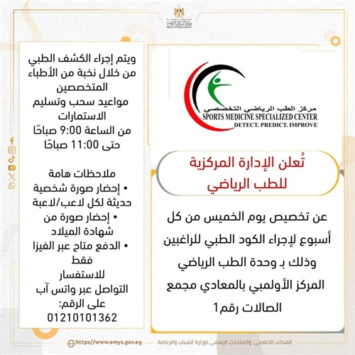 في إطار توجيهات معالي الأستاذ الدكتور أشرف صبحي وزير الشباب والرياضة، وحرص الوزارة على حماية صحة الأبطال الرياضيين من اللاعبين واللاعبات، ورفع كفاءة الأداء، والتأكد من الجاهزية الطبية لمختلف المراحل السنية وفي جميع الألعاب الرياضية، أعلنت الإدارة المركزية للطب الرياضي عن تخصيص يوم الخميس من كل أسبوع لإجراء الكود الطبي للراغبين.