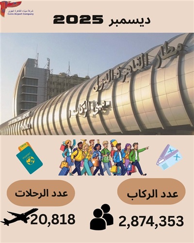 وبلغ إجمالي عدد الرحلات الجوية خلال الفترة من 1 إلى 31 ديسمبر 2025 نحو 20.8 ألف رحلة جوية، بنسبة زيادة قدرها 12% مقارنة بنحو 18.6 ألف رحلة خلال ديسمبر 2024.