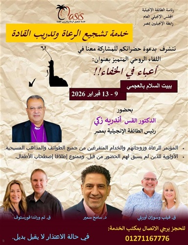 بحضور رئيس الطائفة الإنجيلية وأكثر من 160 راعي وخادم غداً بدأ فاعليات مؤتمر الرعاة والقادة ببيت السلام بالعجمي