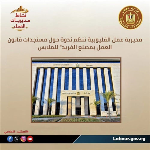 تحت رعاية الوزير حسن رداد، ومحافظ القليوبية حسام عبد الفتاح، نظمت مديرية عمل القليوبية بإشراف فوزي صابر مدير المديرية، ندوة تثقيفية بمصنع "ألفريد" للملابس الجاهزة بالخانكة، تناولت شرح أحكام قانون العمل الجديد رقم 14 لسنة 2025 بمشاركة 20 من العاملين.