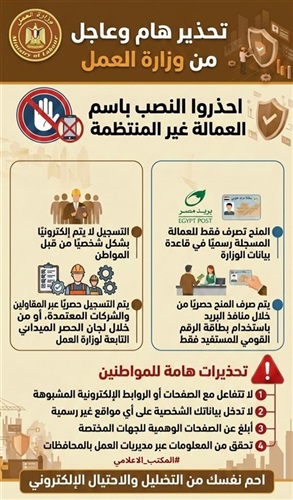 وتهيب الوزارة بجميع المواطنين ضرورة توخي الحذر وعدم الانسياق وراء هذه المحاولات الاحتيالية، وعدم التفاعل مع الصفحات أو الروابط الإلكترونية المشبوهة، أو إدخال البيانات الشخصية على أي مواقع غير رسمية، مع سرعة الإبلاغ عن أي صفحات أو جهات وهمية للجهات المختصة، والتأكد من صحة المعلومات من خلال مديريات العمل بالمحافظات..كما تؤكد وزارة العمل استمرارها في تكثيف جهود التوعية لحماية المواطنين وضمان وصول الدعم إلى مستحقيه دون أي استغلال أو تلاعب.