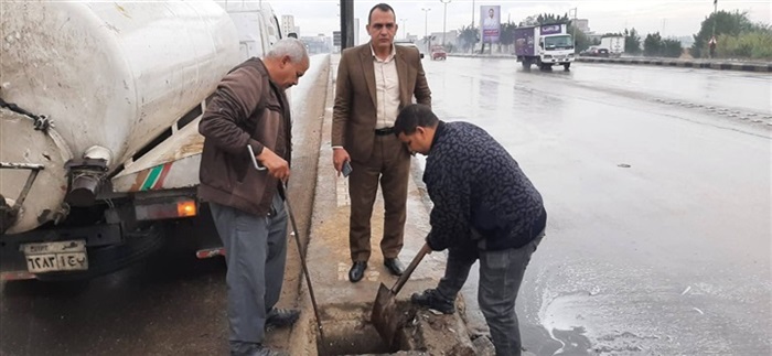 وخلال جولته، تابع رئيس المدينة أعمال كسح وشفط تجمعات مياه الأمطار، والتأكد من جاهزية صفايات المطر وشبكات الصرف، ورفع كفاءتها للعمل بكامل طاقتها، بما يضمن سرعة تصريف المياه وعدم تراكمها، خاصة بالمناطق المنخفضة، بما لا يؤثر على حركة المواطنين أو السيارات.
