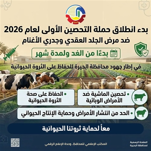 وتناشد محافظ البحيرة جميع المربين وأصحاب الثروة الحيوانية بسرعة الاستجابة والتعاون مع فرق التحصين، حفاظًا على حيواناتهم من الأمراض الوبائية، وتقليل الخسائر الاقتصادية، مشددة على أن التحصين يمثل خط الدفاع الأول لحماية الثروة الحيوانية.