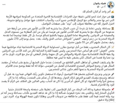 أوضح الكاتب الصحفي ضياء رشوان، وزير الدولة للإعلام، استشهاده بمثال ما يشتريه الحد الأدنى للأجور في مصر من أرغفة خبز مدعومة من الدولة، مع ما يشتريه الحد الأدنى للأجور في فرنسا، أنه لم يكن من أجل المقارنة بين مستوى الدخل والمعيشة في الدولتين، والمعروفة تماما الفوارق بينهما بالطبع لصالح فرنسا، بل كان فقط توضيحا لما تقدمه الدولة المصرية من دعم لرغيف "العيش" للمواطن صاحب الحق والبلد، بعدد يصل يوميا إلى 270 مليون رغيف يحصل عليها أكثر من 55 مليون مصرى.