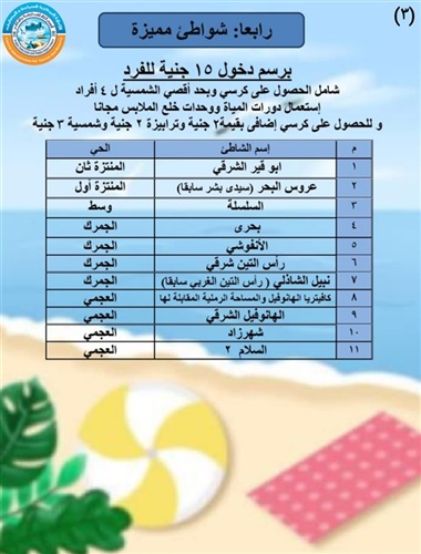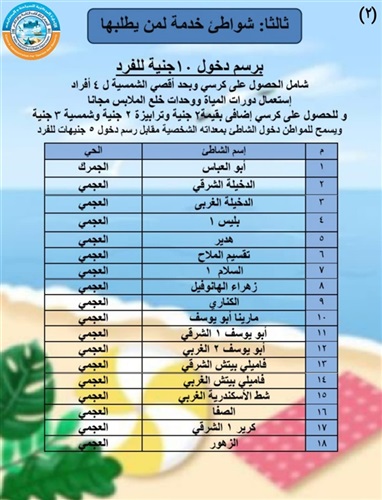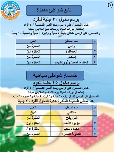 وهي شواطئ برسم دخول ٥ جنيهات للفرد، شامل كرسي وبحد أقصى الشمسية لعدد ٤ افراد، واستعمال دورات المياه ووحدات خلع الملابس مجاناً، وللحصول على كرسي إضافي بقيمة ١ جنيه وترابيزة ٢ جنيه وشمسية ٣ جنيهات، بيانها كالتالي:ـ