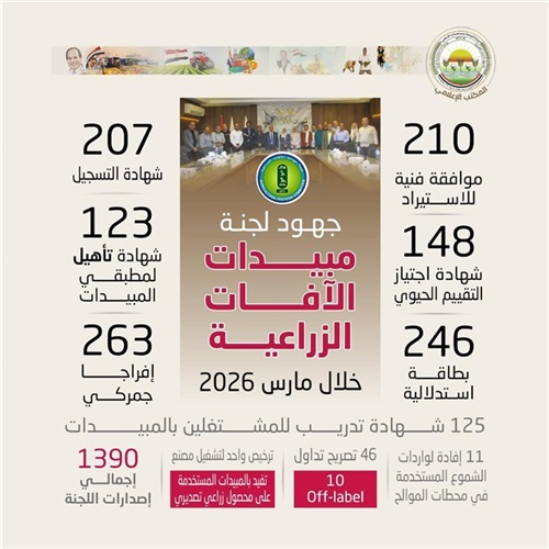 من جانبها، أكدت الدكتورة هالة أبو يوسف، رئيس لجنة مبيدات الآفات الزراعية، أن اللجنة أصدرت 210 موافقة فنية للاستيراد، و263 إفراجًا جمركيًا، إلى جانب إصدار 207 شهادة تسجيل، و 246 بطاقة استدلالية، و11 إفادة، و148 شهادة اجتياز للتقييم الحيوي، و46 تصريح تداول للمبيدات المجهزة محليا، و10 بطاقات للمبيدات المستخدمة على المحاصيل التصديرية، وتصريح واحد لتشغيل مصنع، وذلك في إطار إحكام الرقابة على منظومة تسجيل وتداول المبيدات، وضمان مطابقتها للمواصفات القياسية المعتمدة، بما يحافظ على سلامة المنظومة الزراعية ويعزز الثقة في المنتجات المتداولة بالسوق المحلية.