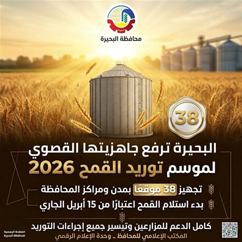 ومن جانبه اشار محمد هدية وكيل وزارة التموين بالبحيرة، أنه تم تجهيز 38 موقعًا لاستقبال الأقماح بمختلف مراكز المحافظة، على أن يبدأ موسم التوريد رسميًا اعتبارًا من 15 أبريل 2026.