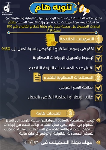 كما تهيب محافظة الإسكندرية بأصحاب المحال العامة سرعة التوجه إلى المركز التكنولوجي بالحي المختص لبدء إجراءات الترخيص والاستفادة من التسهيلات الجديدة، تفاديًا للتعرض لأي مخالفات أو غرامات قانونية.