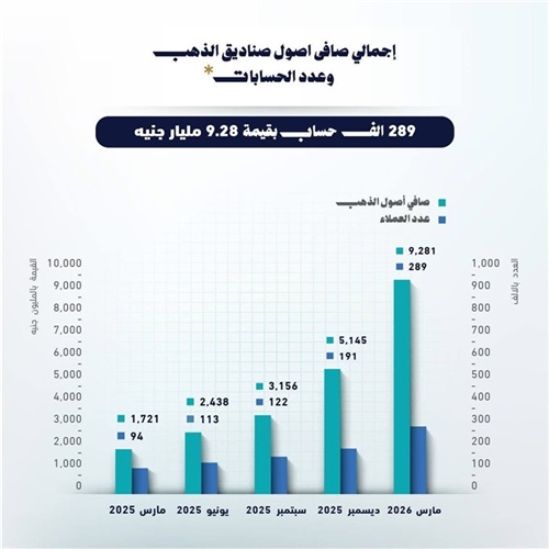 أظهرت أحدث التقارير الصادرة من الهيئة العامة للرقابة المالية، أن إجمالي قيمة صافى أصول صناديق الاستثمار في الذهب بلغ قيمته 9.28 مليار جنيه بنهاية مارس 2026، وذلك من خلال 289 ألف حساب.