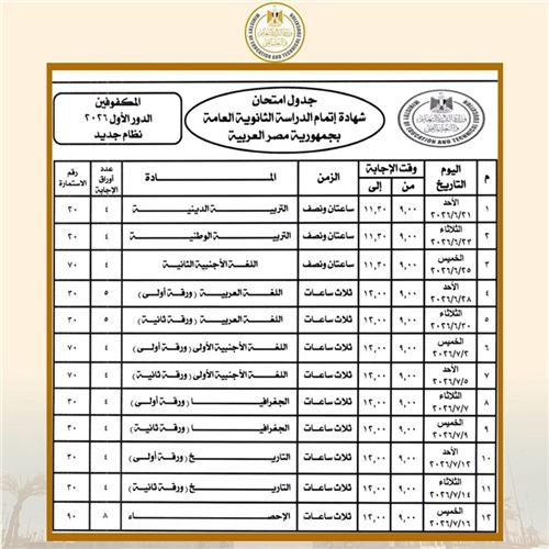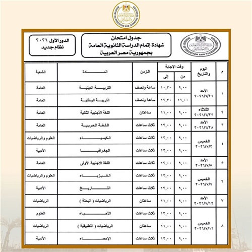 وبحسب جداول امتحانات الثانوية العامة، تبدأ امتحانات الثانوية العامة للدور الأول (نظام جديد - نظام قديم) والمكفوفين يوم الأحد الموافق 21 يونيو 2026، وتستمر حتى يوم الخميس 16 يوليو 2026.