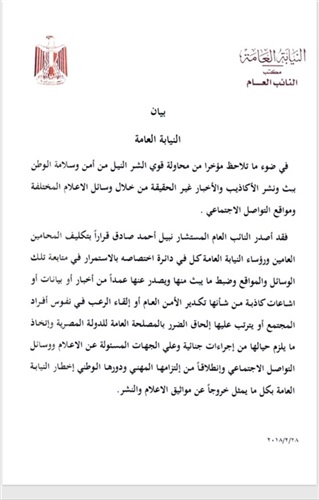 وأكد بيان رسمى صادر من مكتب النائب العام، المحامين العامين ورؤساء النيابات كل فى دائرة اختصاصه، باتخاذ كافة الإجراءات القانونية والجنائية ضد وسائل الإعلام والمواقع التى تبث عمدا أخبارا وبيانات وشائعات كاذبة من شأنها تكدير الأمن العام، أو إلقاء الرعب فى نفوس أفراد المجتمع، وما يترتب عليه من إلحاق الضرر بالمصلحة العامة للدولة المصرية.
