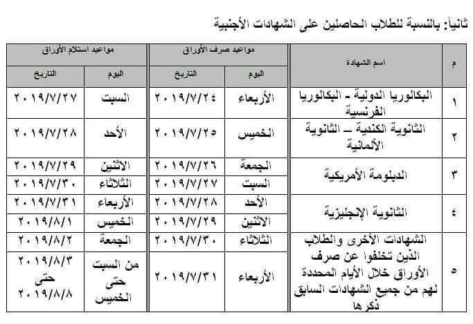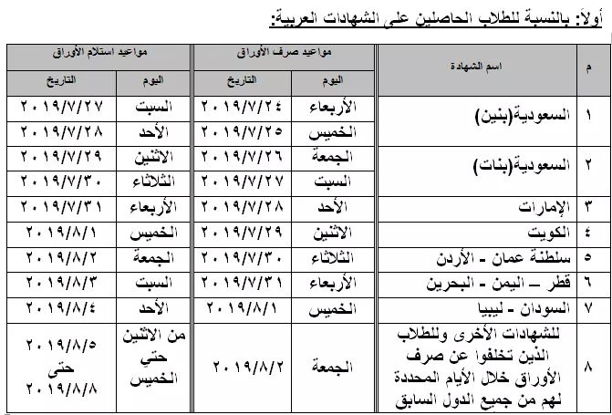 مواعيد صرف واستلام الأوراق مطلوبة من الطلاب المعادلة العربية والأجنبية