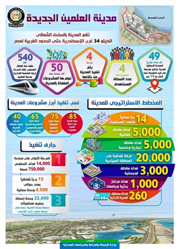 وجاء في الإنفوجراف، أن مدينة العلمين الجديدة, تقع على واجهة متميزة على البحر المتوسط لمسافة تمتد لأكثر من 14 كم بمساحة 49 ألف فدان تقريباً، حيث يتم تنفيذ المدينة من خلال أربعة مراحل، ويصل عدد السكان المستهدف إقامتهم بالمدينة 4 مليون نسمة، ومن المقرر أن يتم تنفيذ قطار مكهرب فائق السرعة لربط العاصمة الإدارية الجديدة بمدينة العلمين بطول نحو 540 كم.