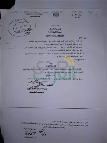 وزير النقل المهندس كامل الوزير يطلق زخات من المدفعية الثقيلة عبر ساحة ميناء الاسكندرية، فقد قرر ندب اللواء حسام الرويني قائما بأعمال الميناء، بعد اعفاء اللواء مدحت عطية من منصبه وإحالته الي مستشار وتشكيل لجنة خماسية لفحص المخالفات المالية والإدارية خلال فترة توليه المسئولية تمهيدا لاتخاذ القرار بشأنها.