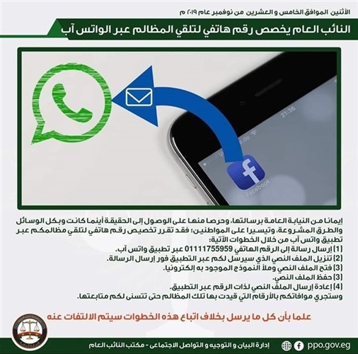 النائب العام يخصص رقم هاتف لتلقي المظالم عبر "واتس آب"