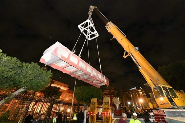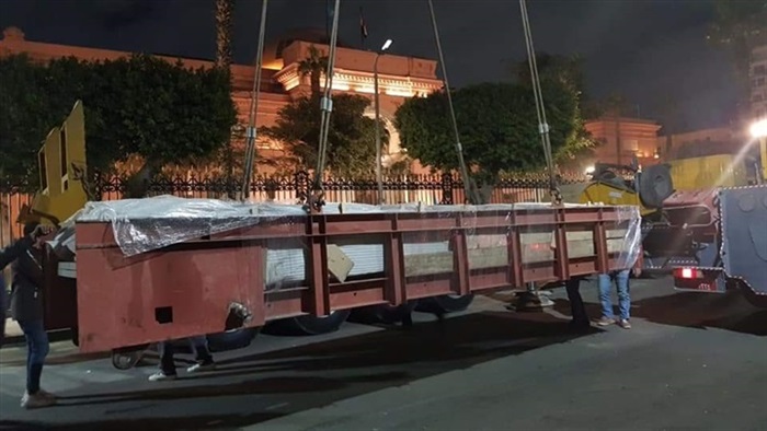 ومن جانبه قال الدكتور عيسي زيدان مدير عام الشئون التنفيذية للترميم ونقل الآثار بالمتحف المصري الكبير أن عمليه النقل سبقها عدة مراحل مختلفة منها التصوير الثلاثي الابعاد والفحص الراداري بالاضافة الى أعمال الترميم الآولي لبعض القطع، مشيرا إلى ان اعمال النقل تمت بالتعاون مع شركة المقاولون العرب مع اتباع اعلي معايير الأمان والسلامة وباشراف المتخصصين بالمتحف المصري الكبير،حيث تم نقل 6 قطع اثرية تتراوح أوزانها بين ٤ و١٦ طن، بالاضافة إلى مجموعة اخري متنوعة من القطع من الاخشاب والأحجار والمعادن و قد تم ايداعها داخل معامل الترميم المخصصة لكل منها للبدء في أعمال الترميم والصيانة بالتحرير، وذلك وسط أجراءات أمنية من شرطة السياحة والآثار وشرطة النجدة.