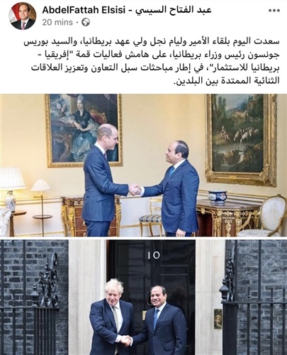 قال الرئيس عبد الفتاح السيسي "سعدت اليوم بلقاء الأمير وليام نجل ولي عهد بريطانيا، والسيد بوريس جونسون رئيس وزراء بريطانيا، على هامش فعاليات قمة "إفريقيا - بريطانيا للاستثمار"، في إطار مباحثات سبل التعاون وتعزيز العلاقات الثنائية الممتدة بين البلدين.