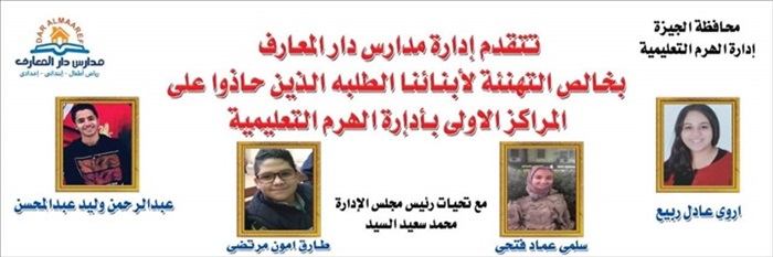 حصلت مدرسة دار المعارف الخاصة عربي على المراكز الاولى فى نتيجة الشهادة الاعدادية على مستوى محافظة الجيزة حيث حصل عدد اربع من طلابها على الدرجات النهائية من أجمالي عدد طلاب المدرسة المقيدين بالشهادة الاعدادية وعددهم 64 طالب وطالبه لتكون اول مدرسة خاصة عربي يحصل معظم طلابها على كامل الدرجات كما حصل اكثر من 40 طالب على درجات فوق 90% وتتقدم ادارة المدرسة بقيادة محمد سعيد ابوكوع رئيس مجلس ادارة المدارس بالشكر للطلاب المتفوقين واولياء امورهم والمعلمين بالمدرسة كما حثت باقي الطلاب على ضرورة بزل المزيد من الجهد والعرق للحصول على اعلى الدرجات