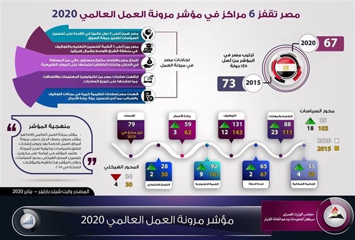 نشر مركز المعلومات ودعم اتخاذ القرار بمجلس الوزراء انفوجراف حول تقدم مصر 6 مراكز في مؤشر مرونة العمل العالمي 2020.