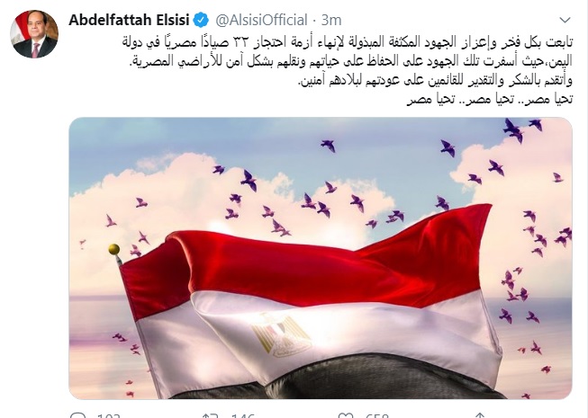 وقال الرئيس السيسي، عبر حسابة الرسمي على موقع التواصل الاجتماعي "تويتر": "تابعت بكل فخر وإعزاز الجهود المكثفة المبذولة والتي استمرت لعدة أيام لإنهاء أزمة احتجاز ٣٢ صيادًا مصريًا في دولة اليمن، حيث أسفرت تلك الجهود على الحفاظ على حياتهم ونقلهم بشكل آمن للأراضي المصرية في إطار حرص الدولة على تأمين رعاياها بالداخل و الخارج.. وأتقدم بالشكر والتقدير للقائمين على عودتهم لبلادهم آمنين.. تحيا مصر.. تحيا مصر.. تحيا مصر".