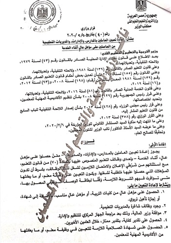التعليم تعلن ضوابط إعادة تعيين العاملين بالمدارس الحاصلين علي مؤهل أثناء الخدمة