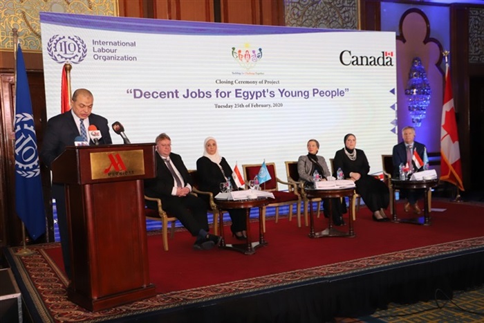 شهد وزراء القوي العاملة، والتضامن الاجتماعي، والتجارة والصناعة ، والبيئة، وسفير كندا في مصر، ومدير الفريق الفني للعمل اللائق لدول شمال أفريقيا مدير مكتب منظمة العمل الدولية بالقاهرة ختام فعاليات مشروع "وظائف لائقة لشباب مصر" الذي تنظمه المنظمة بالتعاون مع وزارة القوي العاملة، بهدف تشغيل الشباب بشكل خاص والحد من البطالة بشكل عام.