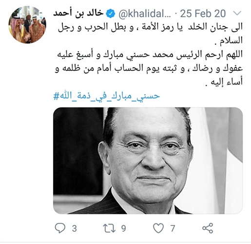 مستشار ملك البحرين للشؤون الدبلوماسية ناعيا الرئيس مبارك: "اللهم ثبته يوم الحساب أمام من ظلمه وأساء إليه"