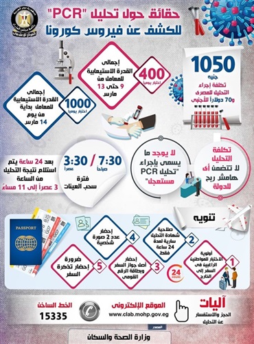 وجاء في الإنفوجراف، أن تكلفة إجراء التحليل للمواطن المصري تبلغ 1050 جنيهاً، بينما تبلغ تكلفتها للأجنبي 70 دولاراً، مع التأكيد بأن تكلفة التحليل لا تتضمن أي هامش ربح للدولة، علماً بأنه لا يوجد ما يسمى بإجراء تحليل PCR"" مستعجل.
