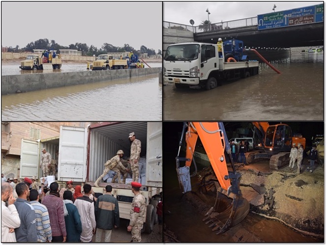 أصدر الفريق أول محمد زكى القائد العام للقوات المسلحة وزير الدفاع والإنتاج الحربى أوامره إلى الهيئة الهندسية للقوات المسلحة للقيام بمعاونة أجهزة الدولة فى رفع الآثار الناتجة عن موجة الطقس السىء التى ضربت البلاد خلال الأيام الماضية ودفع عربات وماكينات شفط المياه المجهزة للمساهمة فى تنفيذ أعمال الإغاثة للطرق المتضررة بمناطق عدة منها مصر الجديدة و طريق الأوتوستراد ونفق العروبة بصلاح سالم ، وطريق السويس ومداخل مدن الرحاب ومدينتى من خلال دفع أطقم الإغاثة بطاقة 35 طاقم إغاثة وعدد 64 عربة كاسحة للمياه .