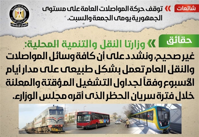 كشف المركز الإعلامى لمجلس الوزراء إنه فى ضوء ما تردد من أنباء بتوقف حركة المواصلات العامة على مستوى الجمهورية يومي الجمعة والسبت ، تواصل المركز مع وزارتي النقل والتنمية المحلية، وقد تم نفي تلك الأنباء، وأكدتا أنه لا صحة لتوقف حركة المواصلات العامة على مستوى الجمهورية يومي الجمعة والسبت، وشددتا على أن كافة وسائل المواصلات والنقل العام تعمل بشكل طبيعي على مدار أيام الأسبوع، وفقاً لجداول التشغيل المؤقتة والمعلنة خلال فترة سريان الحظر الذى أقره مجلس الوزراء.
