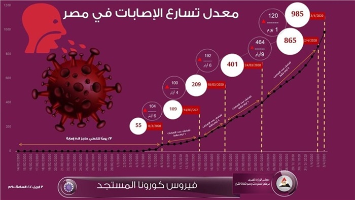 واظهر الرسم البياني معدلات الإصابة منذ بداية ظهور الفيروس في مصر حتى مساء اليوم والذي وصل الى 985 حالة إصابة اليوم .