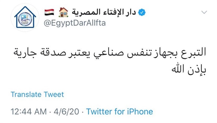 قالت دار الافتاء المصرية أن التبرع بجهاز تنفس صناعى يعتبر صدقة جارية إن شاء الله، وذلك ضمن الاسئلة التى تتلقاها الدار حول الأحكام الشرعية عند نزول البلاء .