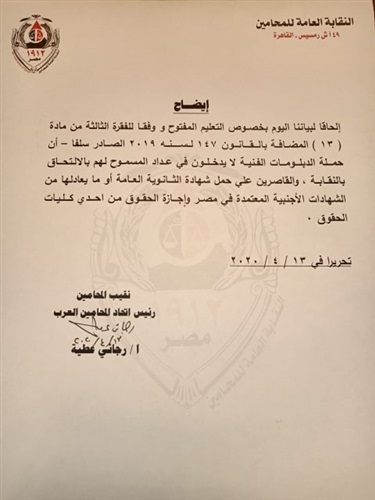 قالت نقابة المحامين في إيضاح لها،أنه إلحاقا لبياننا اليوم الاثنين، بخصوص التعليم المفتوح ووفقا للفقرة الثالثة من مادة (13) المضافة بالقانون 147 لسنة 2019 الصادر سلفا – أن حملة الدبلومات الفنية لا يدخلون في عداد المسموح لهم بالالتحاق بالنقابة، والقاصرين على حمل شهادة الثانوية العامة أو ما يعادلها من الشهادات الأجنبية المعتمدة في مصر وإجازة الحقوق من احدى كليات الحقوق.