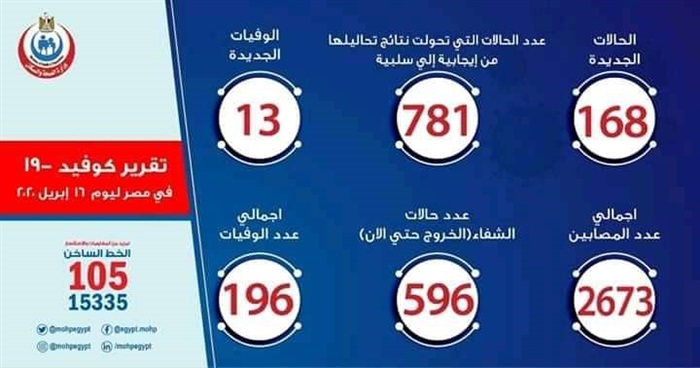 وذكر "مجاهد" أن إجمالي العدد الذي تم تسجيله في مصر بفيروس كورونا المستجد حتى اليوم الخميس، هو 2673 حالة من ضمنهم 596 حالة تم شفاؤها وخرجت من مستشفيات العزل، و196 حالة وفاة.