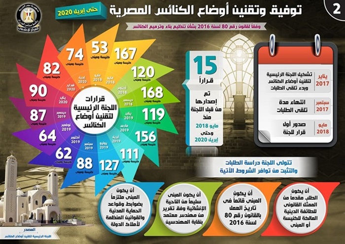 ورصد الانفوجراف، صدور 15 قراراً للجنة بشأن توفيق أوضاع الكنائس والمباني التابعة حتى أبريل 2020، كان أولها في مايو 2018، وذلك بعد انتهاء مدة تلقي الطلبات في سبتمبر 2017، على النحو التالي: في مايو 2018 صدر قراران الأول بتقنين أوضاع 53 كنيسة ومبنى، والثاني بتقنين أوضاع 167 كنيسة ومبنى، وفي أكتوبر 2018 صدر قرار بتقنين أوضاع 120 كنيسة ومبنى، كما أن هناك 168 كنيسة ومبنى تم تقنين أوضاعها في ديسمبر 2018، و119 كنيسة ومبنى تم تقنين أوضاعها في يناير 2019، و156 كنيسة ومبنى تم تقنين أوضاعها في مارس 2019، و111 كنيسة ومبنى تم تقنين أوضاعها في أبريل 2019، و127 كنيسة ومبنى تم تقنين أوضاعها في يوليو 2019، و88 كنيسة ومبنى تم تقنين أوضاعها في سبتمبر 2019، و62 كنيسة ومبنى تم تقنين أوضاعها في أكتوبر 2019، و64 كنيسة ومبنى تم تقنين أوضاعها في نوفمبر 2019، و87 كنيسة ومبنى تم تقنين أوضاعها في ديسمبر 2019، و90 كنيسة ومبنى تم تقنين أوضاعها في يناير 2020، و82 كنيسة ومبنى تم تقنين أوضاعها في فبراير 2020، وفي أبريل 2020 تم تقنين أوضاع 74 كنيسة ومبنى.