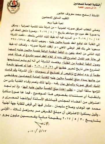 خاطب نقيب المحامين رجائي عطية، النقيب السابق سامح عاشور، بشأن الخطاب الموجه من شركة دلتا للتنمية العمرانية، مطالبا إياه بإفادته عما إذا كان واجبا على النقابة من عدمه، أن ترد مبلغ الخمسة ملايين جنيه إلى شركة دلتا للتنمية العمرانية، وإيضاحات بشأن الموضوع برمته.