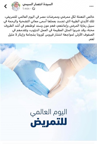 وكتبت السيدة انتصار السيسي، على صفحتها الرسمية بموقع التواصل الاجتماعى "فيس بوك": "تلك الأیدى الطیبة التى تجسد بعملھا أسمى معانى التضحیة والرحمة فى سبیل رعایة المرضى وإعانتھم، فھم عون وسند لوطنھم فى أشد الظروف محنة، وقد ضربوا المثل العظیمة فى العمل الدؤوب، وتقدمھم فى الصفوف الأولى لمواجھة انتشار فیروس كورونا بشجاعة وإیثار لا مثیل لھم".