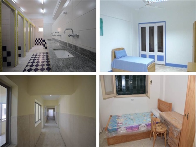 حيث تم تنفيذ أعمال الإحلال والتطوير لجميع واجهات المبانى الخارجية والمداخل الرئيسية وأعمال التنسيق الحضاري ورفع كفاءة أماكن المبيتات والآثاث والمطابخ ودورات المياه ، كما تم تنفيذ أعمال التجديد للأرضيات والدهانات للأسقف والحوائط الداخلية والخارجية .