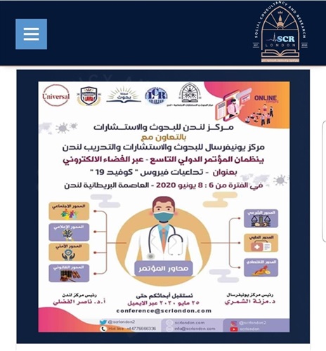 مركز لندن للبحوث والاستشارات بالتعاون مع مركز يونيفرسال للبحوث والاستشارات والتدريب لندن ينظمان المؤتمر الدولي التاسع- عبر الفضاء الإلكتروني بعنوان- تداعيات فيروس "كوفيد 19" في الفترة من 6 :8 يونيو 2020- العاصمة البريطانية لندن.