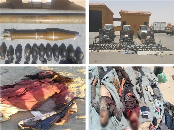 إستمراراً لجهود القوات المسلحة المكثفة فى مكافحة الإرهاب خلال الأسبوع الماضى ، وبناءاًعلى معلومات إستخباراتية تفيد بتواجد عناصر تكفيرية بعدة أوكار إرهابية فى محيط مدن بئر العبد والشيخ زويد ورفح بشمال سيناء ، قام أبطال القوات المسلحة بتنفيذ عدد (2)عملية نوعية أسفرت عن مقتل عدد (3) فرد تكفيرى شديدى الخطورة ، عثر بحوزتهمعلى بنادق آلية ، وقنابل يدوية ، ودانات ( (RBJ، كما قامت عناصر المهندسين العسكريين بإكتشاف وتدمير عدد (5) عبوة ناسفة تم زراعتها لإستهداف قواتنا على محاور التحرك .