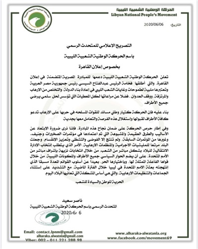 أعلنت الحركة الوطنية الشعبية الليبية دعمها للمبادرة المصرية المُتضمنة في إعلان القاهرة، والتي أطلقها الرئيس عبدالفتاح السيسي رئيس جمهورية مصر العربية، معتبرة إياها مُلبية لطموحات وغايات الشعب الليبي في إعادة بناء الدولة، والتخلص من الإرهاب والمرتزقة، ووقف العدوان، فضلاً عن مراعاتها لكل المعطيات التي تؤسس لحل سلمي يرضي جميع الأطراف.