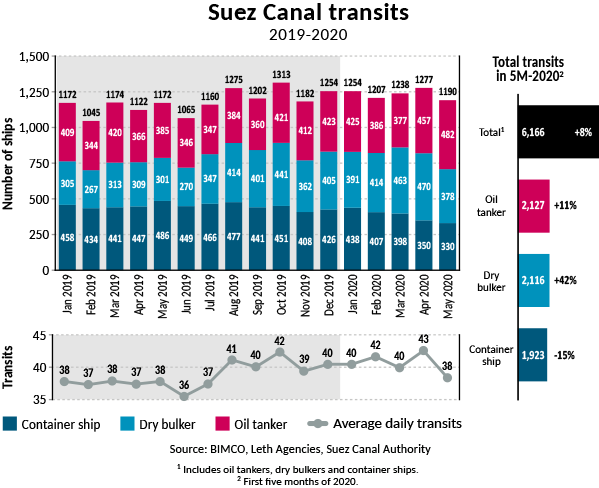 كما استعرض التقرير ارتفاع معدلات عبور ناقلات البترول عبر القناة خلال شهري إبريل ومايو الماضيين مقارنة بذات الفترة من العام الماضي، كما شكل عبور ناقلات البترول ما يقرب من 29% من إجمالي حركة عبور السفن في القناة خلال الفترة من يناير إلى مايو 2020، وذلك في ظل زيادة الطلب وتشريعات المنظمة البحرية الدولية IMO بخصوص نسبة الكبريت.