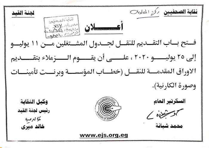 نقابة الصحفيين تعلن فتح باب التقدم لجدول المشتغلين بداية من 11 يوليو