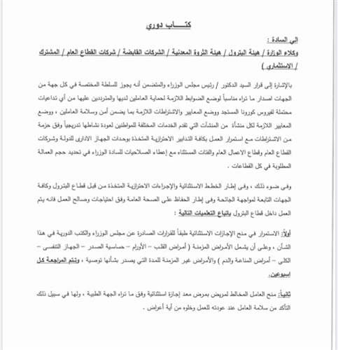 أصدر المهندس طارق الملا، وزير البترول والثروة المعدنية كتابًا دورًيا تضمن عدد من الضوابط الخاصة بالعاملين والاجازات للسيدات وأصحاب الأمراض المزمنة كالتالي: