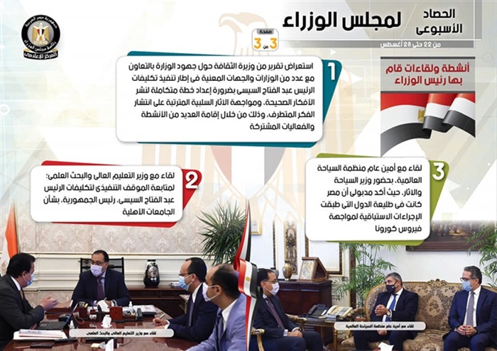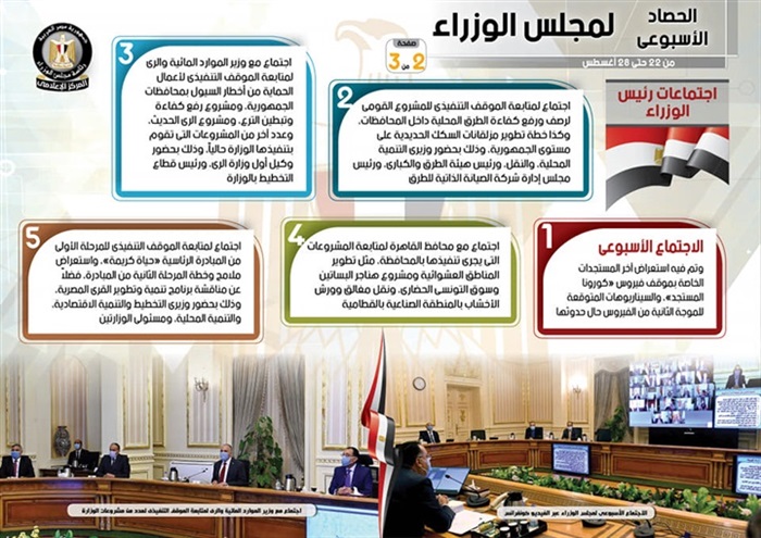 نشر المركز الإعلامي لمجلس الوزراء، تقريراً شمل إنفوجرافات سلط من خلالها الضوء على الحصاد الأسبوعي لمجلس الوزراء، وذلك خلال الفترة 22 حتى 28 أغسطس 2020، والذي تضمن الموافقة على عدد من القرارات، فضلاً عن الاجتماعات واللقاءات التي عقدها الدكتور مصطفى مدبولي، رئيس مجلس الوزراء، بالإضافة إلى ما قام به سيادته من أنشطة.