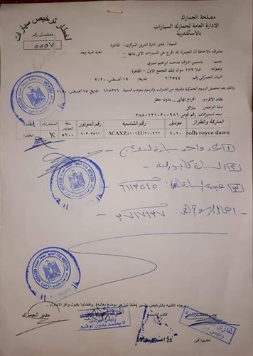 ١- تم تسجيل البيان الجمركي رقم 2544 بتاريخ 19/ 8 2020 باسم السيدة/ ياسمين أشرف مدحت ابراهيم صبري ومشمولة طبقا للمعاينة سياره ماركه رولز رايس داون موديل 2020 السعه اللتريه 5600 ( 12 ) سلندر منشأ إنجلترا الشحن من ميناء ليماسول قبرص.