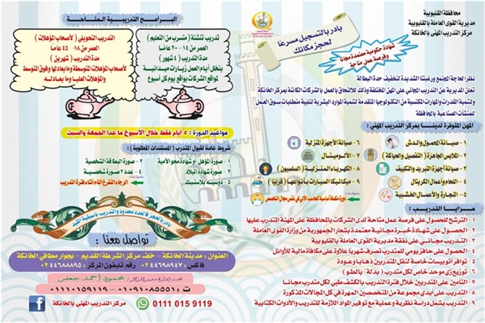وفي هذا الإطار أعلنت مديرية القوي العاملة بالقليوبية ، عن بدء الدورات التدريبية مجانا على 10 مهن مطلوبة في سوق العمل الداخلي والخارجي وذلك بمراكز التدريب المهني التابعة لها ، وذلك نظراً لحاجة المجتمع وتخفيفاً حدة البطالة وتنمية القدرات والمهارات المكتسبة من التكنولوجيا المتقدمة لتنمية الموارد البشرية لتلبية متطلبات سوق العمل .