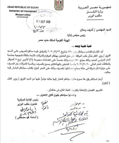 أعلنت الهيئة القومية لسكك حديد مصر، موافقة وزير النقل، على منح جميع العاملين بالهيئة والشركات التابعة وشركة مترو الانفاق بصرف مكافاة تشجيعية بمبلغ ٧٥٠ جنيهًا؛ بمناسبة دخول العام الدراسي الجديد.